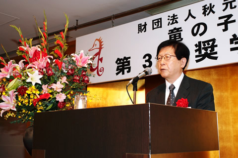 在此我想对大家说的是,财团期待的并不仅仅是各位通过获得奖学金能安心完成学业,将来在各自的专业领域大显身手。正如阿兹哈尼同学所说的那样,同是龙之子奖学生是一种缘份,我们期望大家互相帮助,加深友情,以谦虚的态度努力理解对方,通过今后的不断交流,超越国与国、民族与民族的不同,达到真正的国际相互理解。