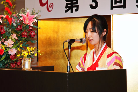 请允许我作为本年度龙之子奖学生的代表做一个简短的发言。6年前我抱着学习日本先进的科学技术和知识、开创新天地的梦想来到日本留学。然而现实是严酷的。5年前我的祖国韩国的经济萧条,因为父亲被公司解雇,所以不能给我寄生活费了。我面临着经济上的困难,每天都在为此烦恼。我不得不靠打工来维持生活和支付学费。我同时打三份工,因为无休无止地打工和学习,精神上和体力上都感到负担很重,一度甚至考虑过放弃留学。